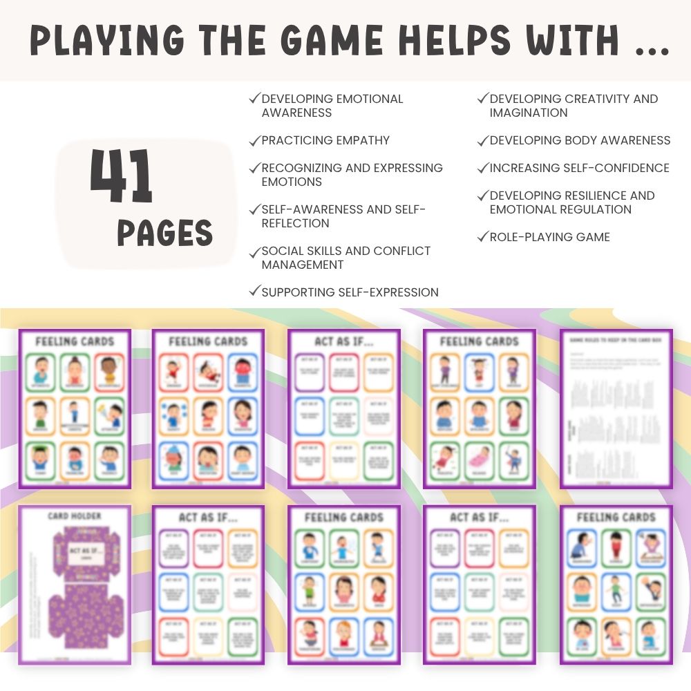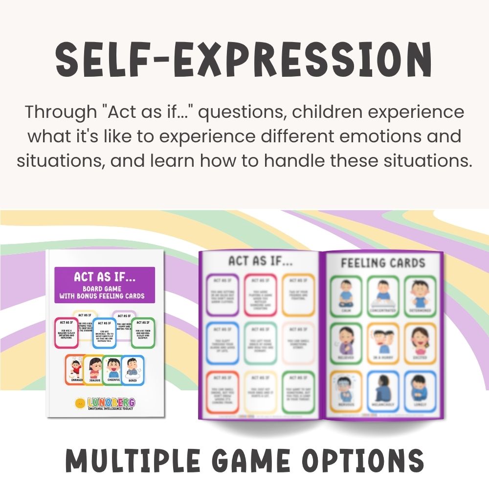 This unique board game includes 99 “Act as if…” task cards designed to help children creatively explore and understand various situations. Each card transports them into a new scenario where they can practice empathy, develop communication skills, and learn to manage their own and others’ emotions—all in a fun and engaging way!
