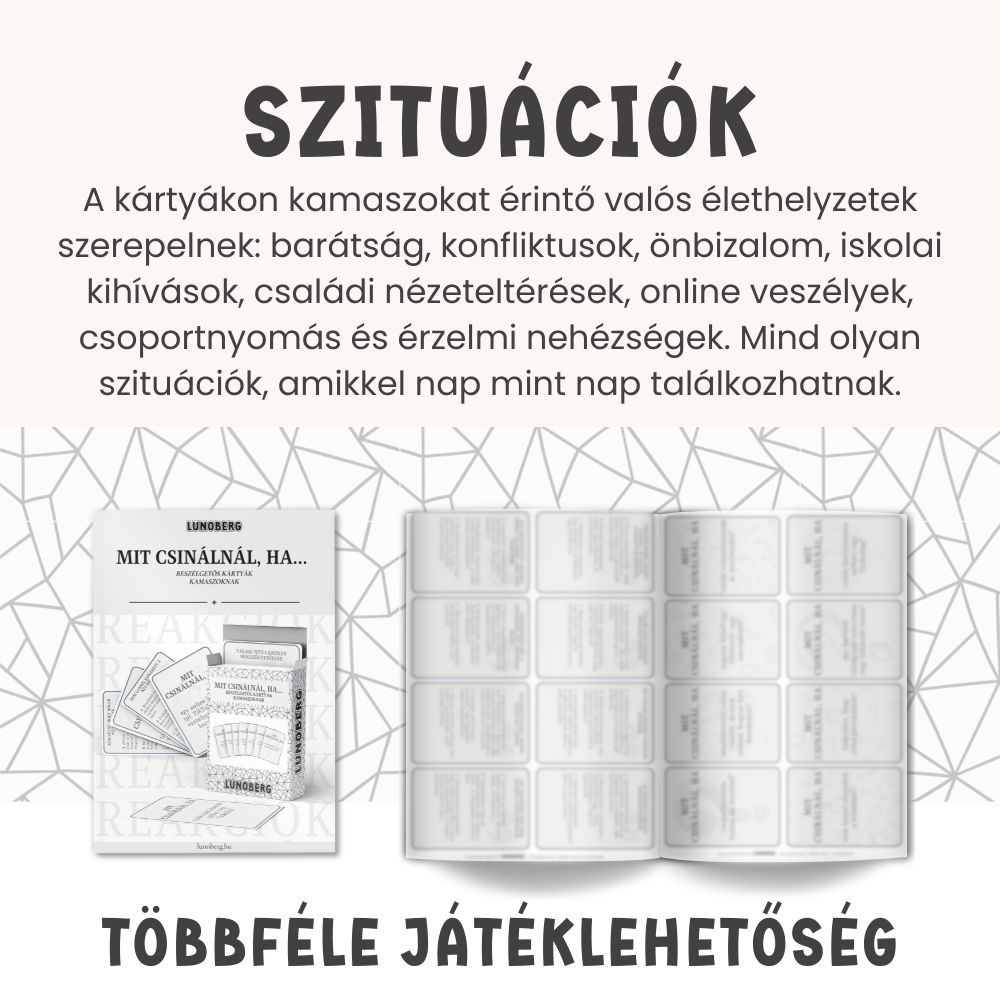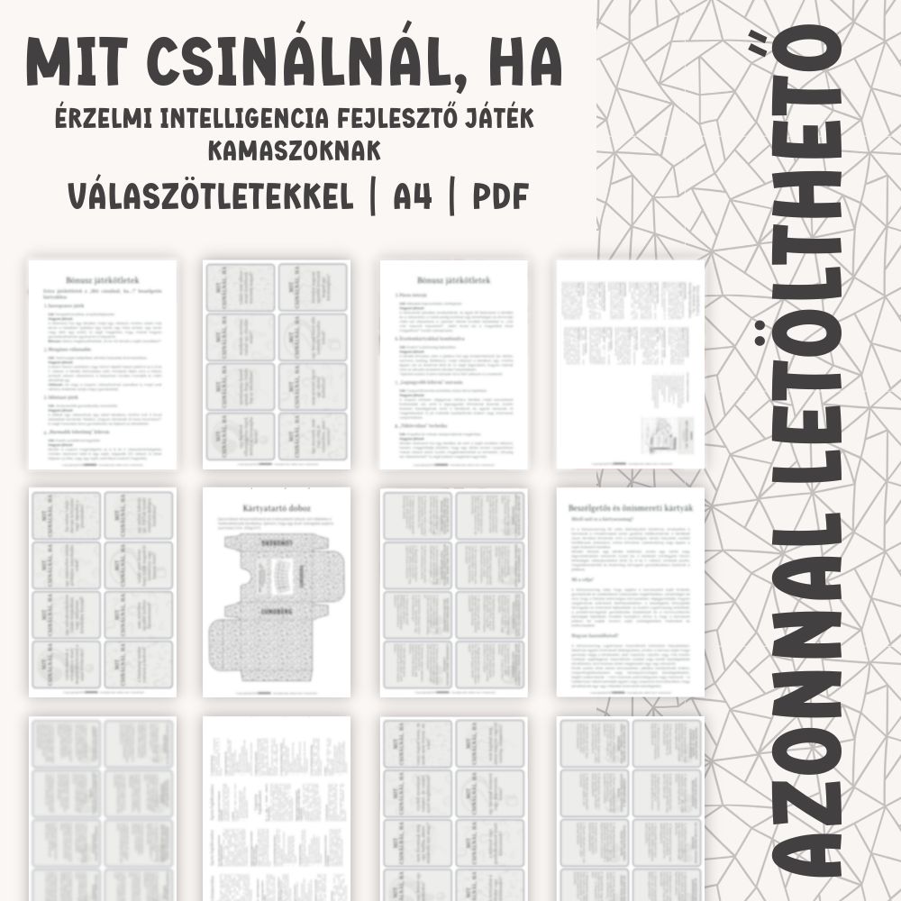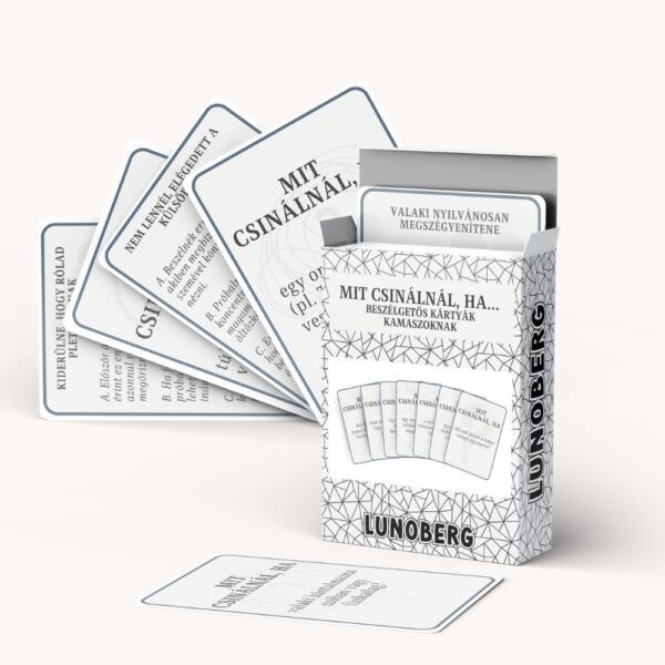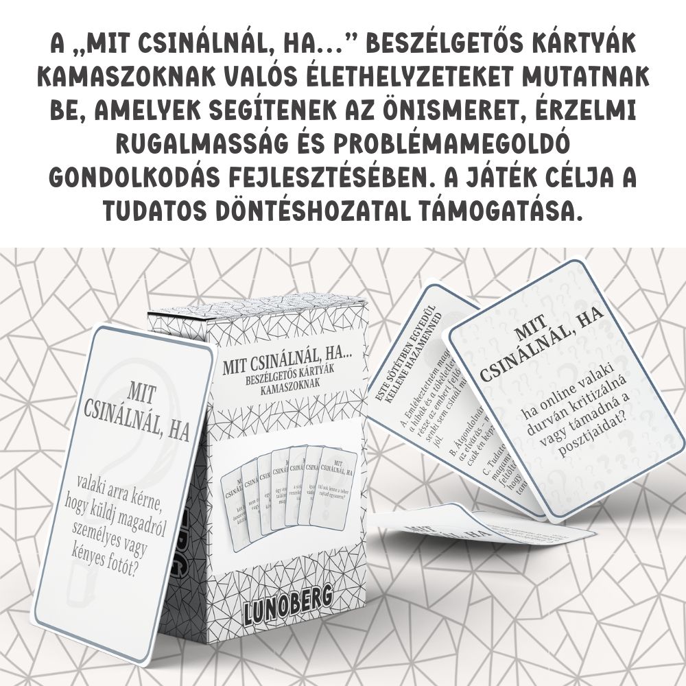 A Mit csinálnál, ha… beszélgetős kártyák kamaszoknak abban segít a kamaszoknak, hogy elgondolkodjanak, hogyan reagálnának a mindennapokban felmerülő, valós élethelyzetekre. A kérdések segítenek szavakba önteni érzéseiket, felismerni saját erőforrásaikat és bátrabban kezelni a kamaszkor kihívásait.