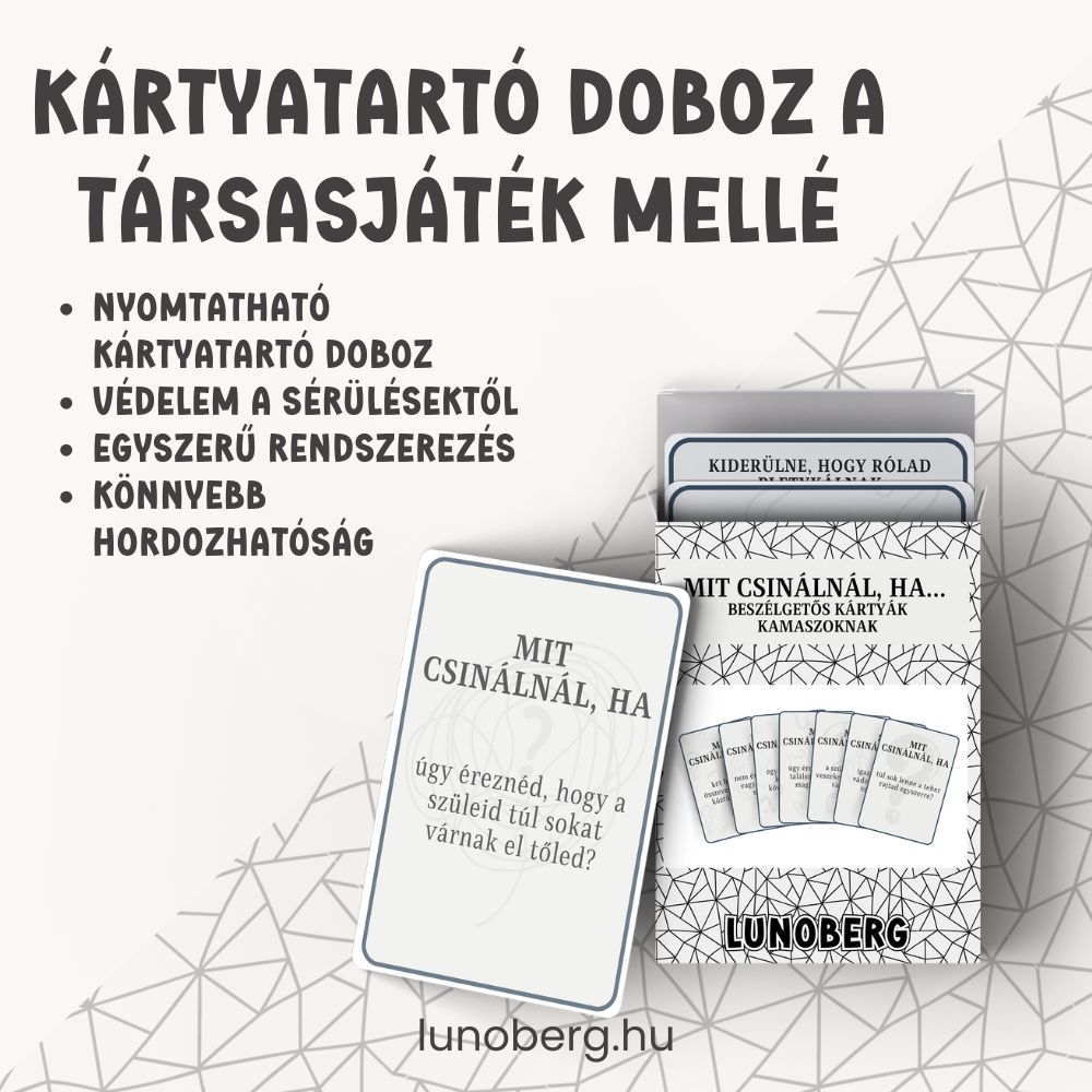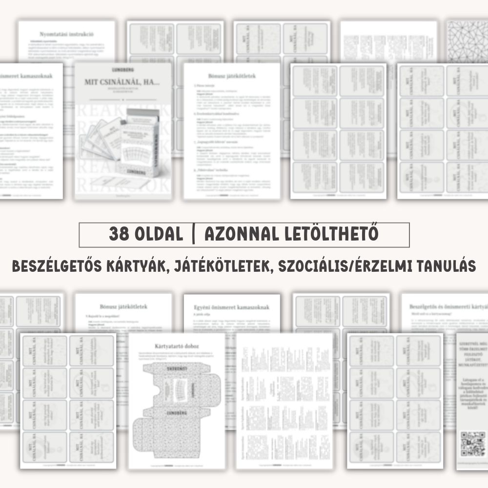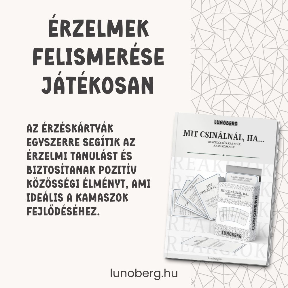 A Mit csinálnál, ha… beszélgetős kártyák kamaszoknak abban segít a kamaszoknak, hogy elgondolkodjanak, hogyan reagálnának a mindennapokban felmerülő, valós élethelyzetekre. A kérdések segítenek szavakba önteni érzéseiket, felismerni saját erőforrásaikat és bátrabban kezelni a kamaszkor kihívásait.