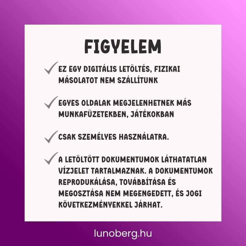 Ezek a munkafüzetek általános használatra készültek. Ez a munkafüzet nem helyettesíti orvos vagy foglalkozásterapeuta tanácsát. A megadott információk nem használhatók diagnosztikai vagy képzési célokra. Ha speciális támogatásra van szükséged, fordulj orvoshoz vagy foglalkozásterapeutához. Hagyj abba minden tevékenységet, ha nem vagy biztos a gyermek reakciójában vagy képességében.