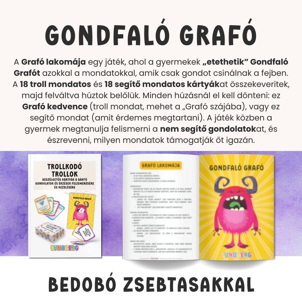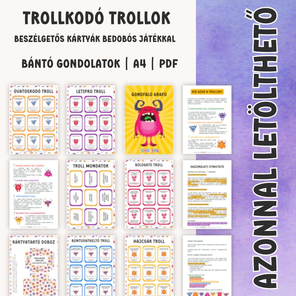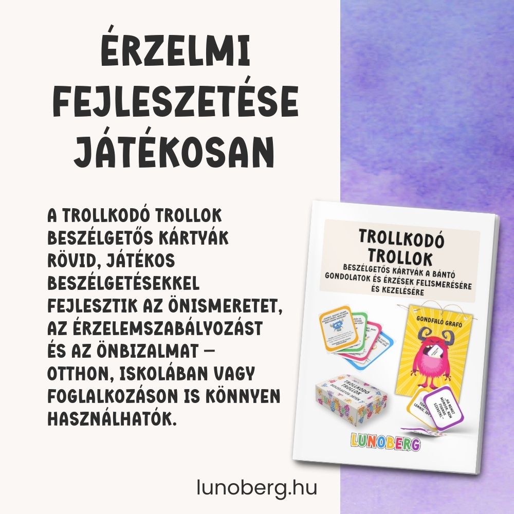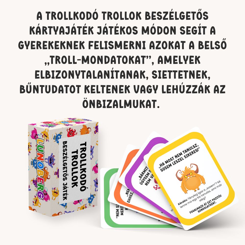 A Trollkodó Trollok | negatív gondolatok elengedése beszélgetős kártyajáték játékos módon segít a gyerekeknek felismerni azokat a belső „troll-mondatokat”, amelyek elbizonytalanítanak, siettetnek, bűntudatot keltenek vagy lehúzzák az önbizalmukat. A kártyák abban támogatnak, hogy a gyerek megtanulja: a gondolat csak egy gondolat – nem mindig igaz, és át lehet fordítani segítő mondattá. A csomag része Gondfaló Graffó is, akibe a „gondot jelentő” mondatokat be lehet dobni, így a tudatosítás egy kézzelfogható, játékos élménnyé válik.