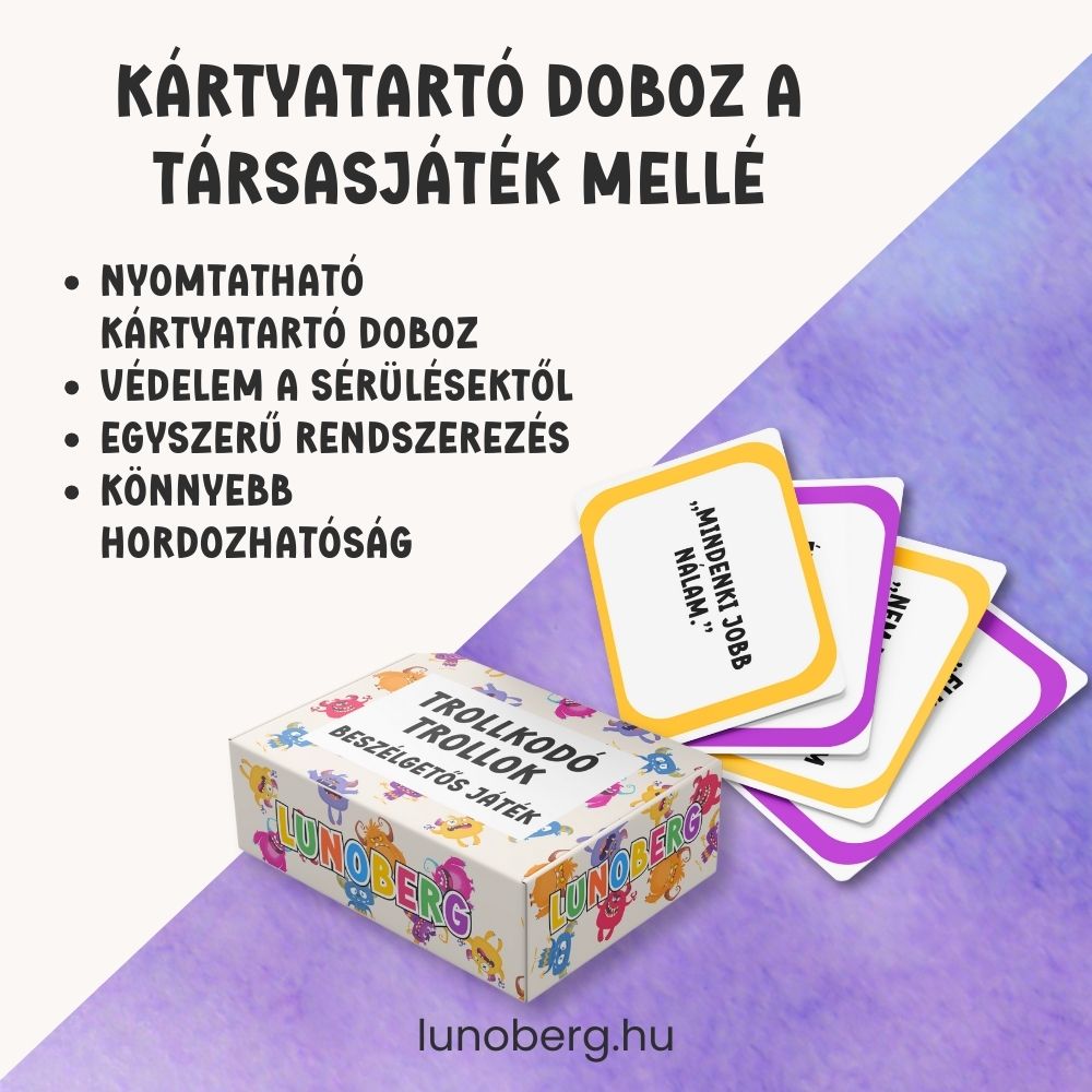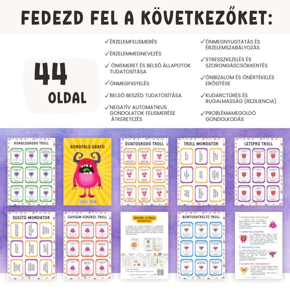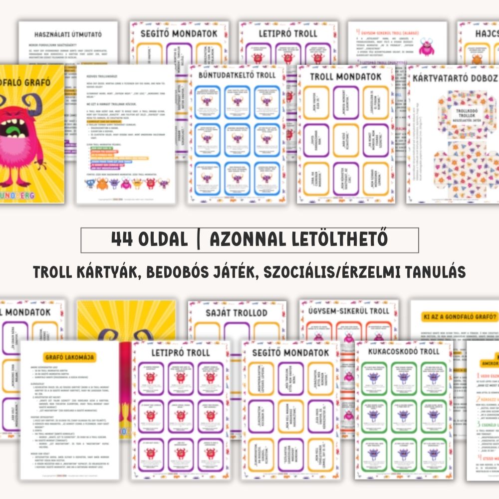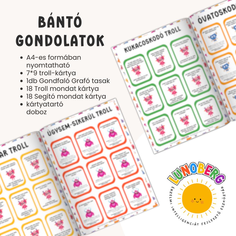 A Trollkodó Trollok | negatív gondolatok elengedése beszélgetős kártyajáték játékos módon segít a gyerekeknek felismerni azokat a belső „troll-mondatokat”, amelyek elbizonytalanítanak, siettetnek, bűntudatot keltenek vagy lehúzzák az önbizalmukat. A kártyák abban támogatnak, hogy a gyerek megtanulja: a gondolat csak egy gondolat – nem mindig igaz, és át lehet fordítani segítő mondattá. A csomag része Gondfaló Graffó is, akibe a „gondot jelentő” mondatokat be lehet dobni, így a tudatosítás egy kézzelfogható, játékos élménnyé válik.